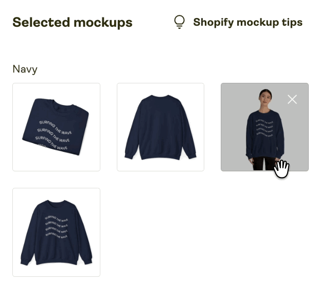 To select mockups for a product in the Mockup Library, simply click on the mockup image you want to include in the listing. The image in the first position will serve as the title mockup.