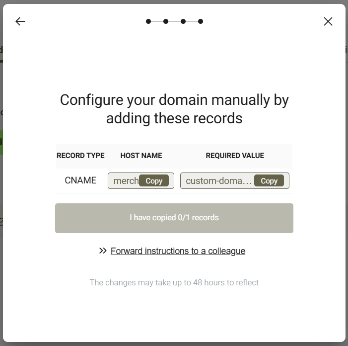 - Once you’ve saved the CNAME records at your domain provider, go back to your Pop-Up Store’s domain settings and in the modal, click the I have added records to my domain’s provider button.